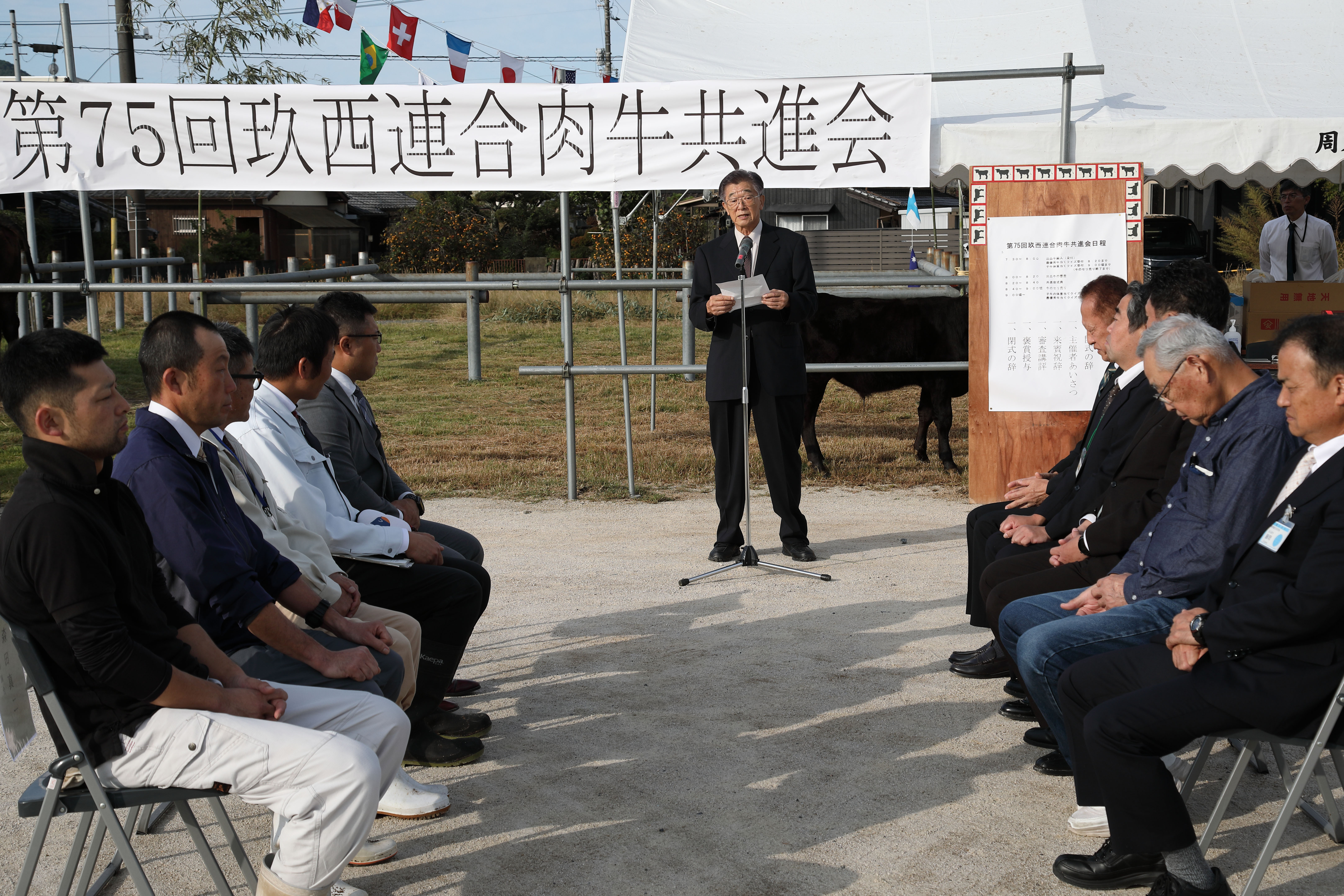 主催の玖西連合共進会より、会長の安堂光明氏が挨拶。そして列席の岩国市長(代理)、山口県東部家畜保健衛生所長らの祝辞が続きました。